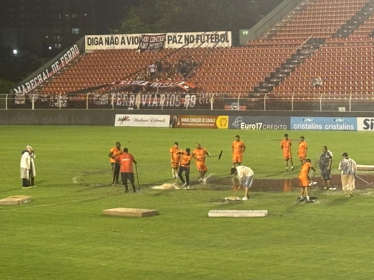 Time usa colchões para tentar secar campo na 2ª divisão de SP Funcionários do Ituano se desdobraram para tentar secar o gramado do estádio Novelli Júnior durante a partida contra o...