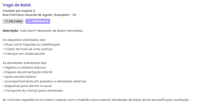 Vaga de Babá - Sophia S. - Ipiranga, Guarapari - ES - Famyle